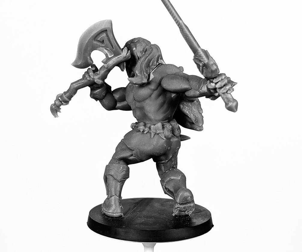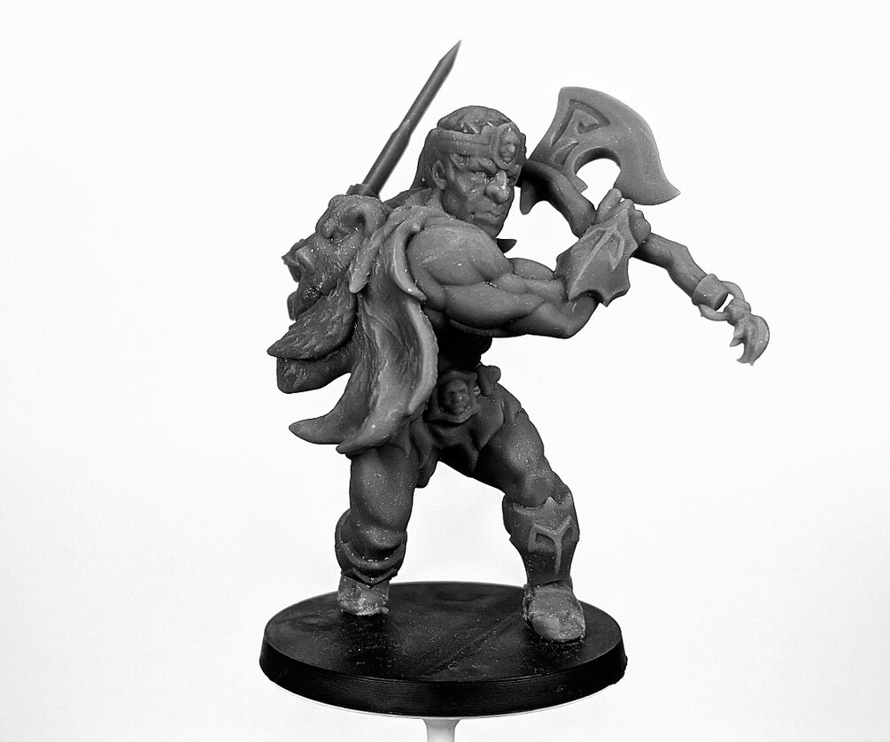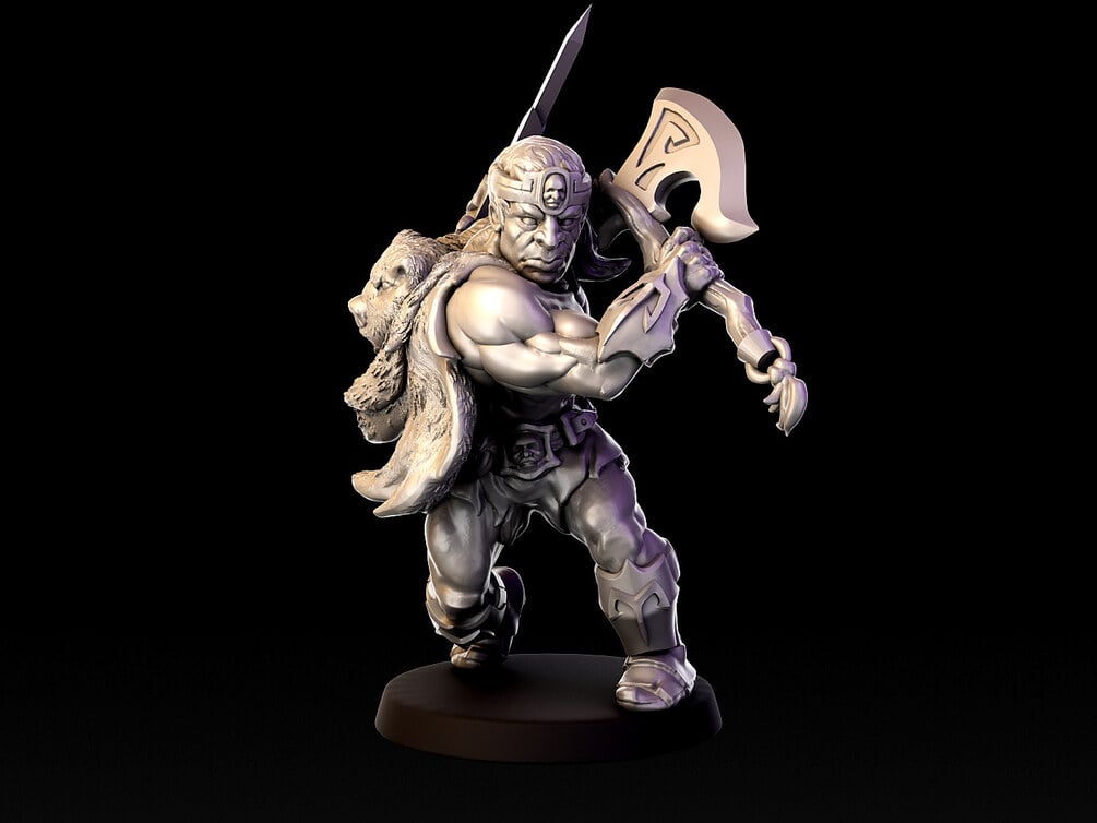 3D printable pre-supported Barbarian King, enjoy! about 55mm from the base to the top of the head.